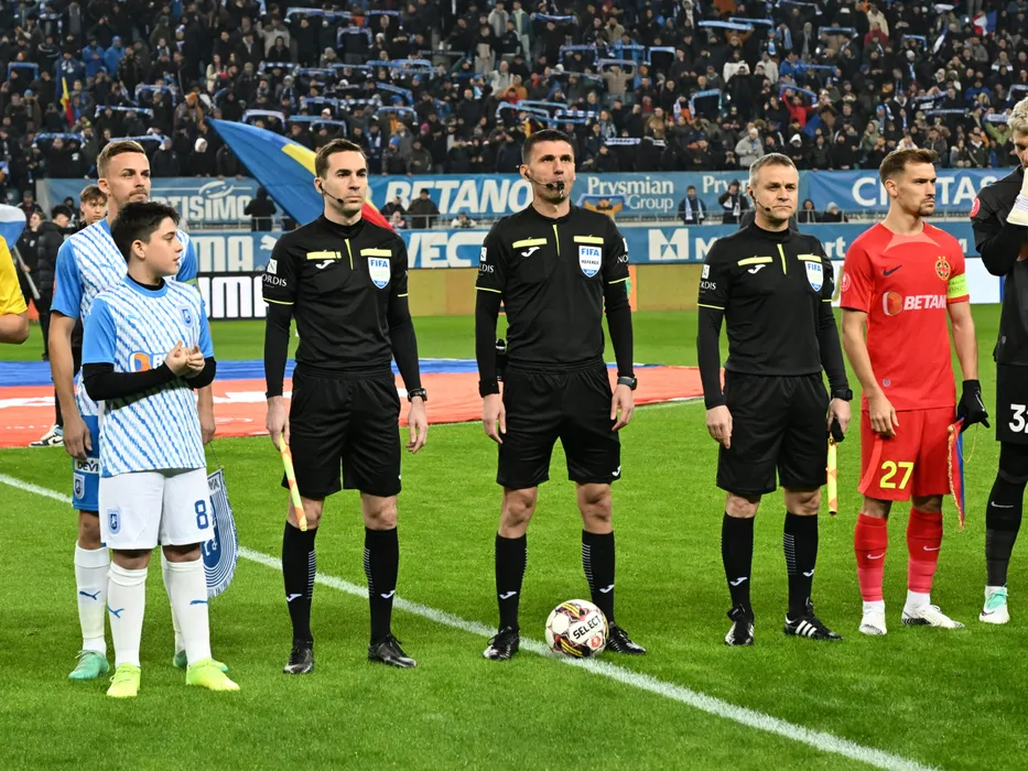 Brigada de arbitrii formată din Vasile Marinescu, Marcel Birsan si Mihai Marius Marica alături de căpitanii Nicușor Silviu Bancu si Darius Dumitru Olaru la meciul de fotbal dintre Universitatea Craiova si FCSB, contând pentru Superliga Superbet, desfășurat pe Stadionul Ion Oblemenco din Craiova, duminica 28 ianuarie 2024. © FOTO: Răzvan PĂSĂRICĂ/SPORT PICTURES