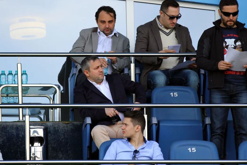 Mihai Rotaru (C), finantatorul CS Universitatea Craiova, urmareste meciul cu FC Bihor, din Liga a II-a la fotbal, la Craiova, sambata, 29 martie 2014. BOGDAN DANESCU / MEDIAFAX FOTO