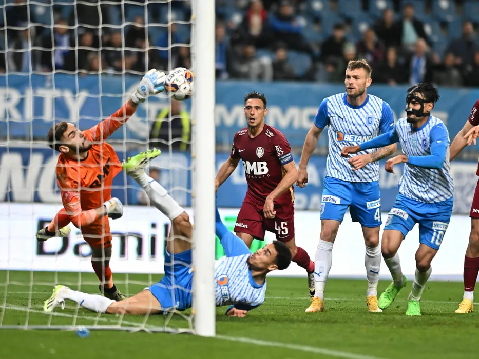 Razvan Sergiu Sava, Henri Hipido Soiri Pyry, Mario Camora (Malico Paulino Mario Jorge), Alexandru Crețu si Ștefan Baiaram in meciul de fotbal dintre Universitatea Craiova si CFR Cluj, contand pentru Play off-ul Superligii Superbet, desfasurat pe Stadionul Ion Oblemenco din Craiova, joi 25 aprilie 2024. © FOTO:Razvan Pasarica/SPORT PICTURES