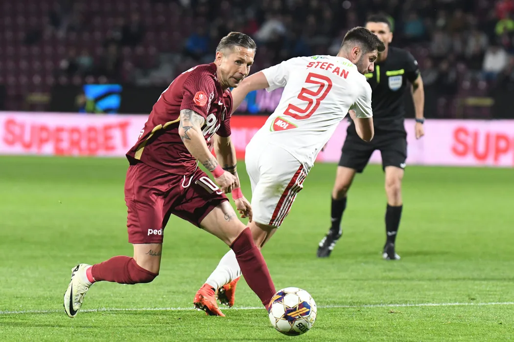 Ciprian Ioan Deac și Florin Bogdan Ștefan în meciul de fotbal dintre FC CFR 1907 Cluj si Sepsi OSK Sfântu Gheorghe, contând pentru Superliga Superbet, desfășurat pe Stadionul Dr.Constantin Rădulescu din Cluj-Napoca, duminică 28 aprilie 2024. © FOTO: Flaviu BUBOI/SPORT PICTURES