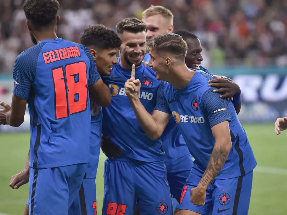 Bucurie a fotbalistilor stelisti dupa un gol marcat cu Florinel Teodor Coman, Andrei Ioan Cordea si David Raul Miculescu in meciul de fotbal dintre FCSB si FK Viking Stavanger, din cadrul play-off-ului UEFA Europa Conference League, desfasurat pe Arena Nationala din Bucuresti, joi 18 august 2022. © FOTO:Razvan Pasarica/SPORT PICTURES