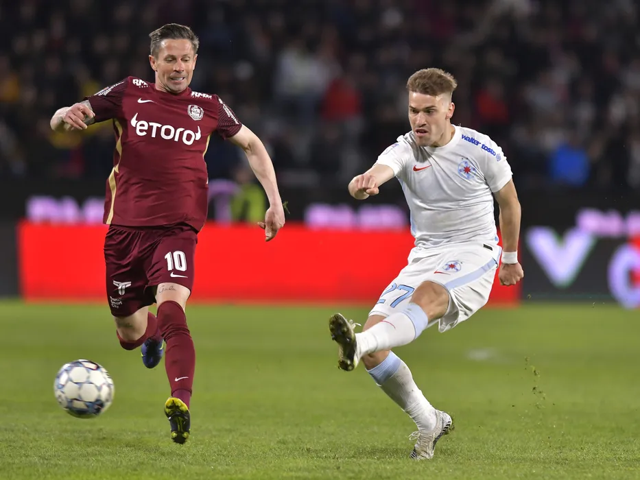 Ciprian Ioan Deac si Darius Dumitru Olaru in meciul de fotbal dintre CFR Cluj si FCSB, contand pentru Play-off-ul Ligii 1 Casa Pariurilor, desfasurat pe Stadionul CFR Dr. Constantin Radulescu din Cluj Napoca, duminica 17 aprilie 2022. © FOTO:Razvan Pasarica/SPORT PICTURES