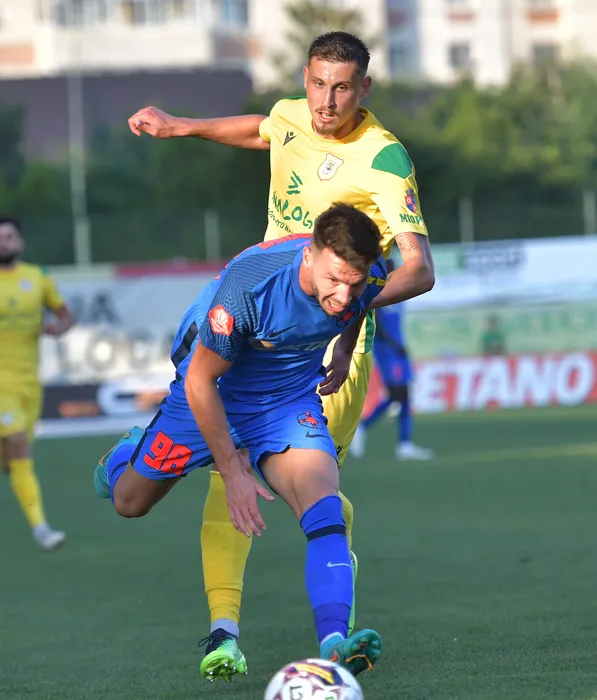 Guilherme Gomes Garutti si Andrei Ioan Cordea in meciul de fotbal dintre CS Mioveni si FCSB, contand pentru Superliga Superbet, desfasurat pe Stadionul Orasenesc din Mioveni, sambata 6 august 2022. © FOTO:Razvan Pasarica/SPORT PICTURES