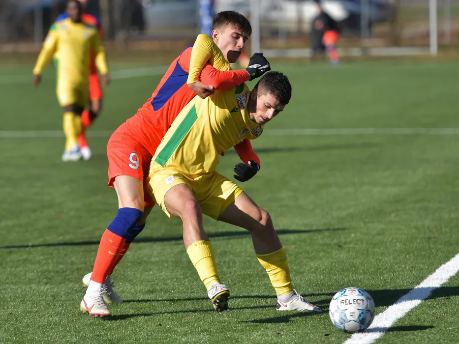 Octavian George Popescu si Daniel Marian Toma in meciul amical de fotbal dintre FCSB si CS Mioveni, desfasurat la Centrul National de Fotbal de la Buftea, sambata 15 ianuarie 2022. © FOTO:Razvan Pasarica/SPORT PICTURES