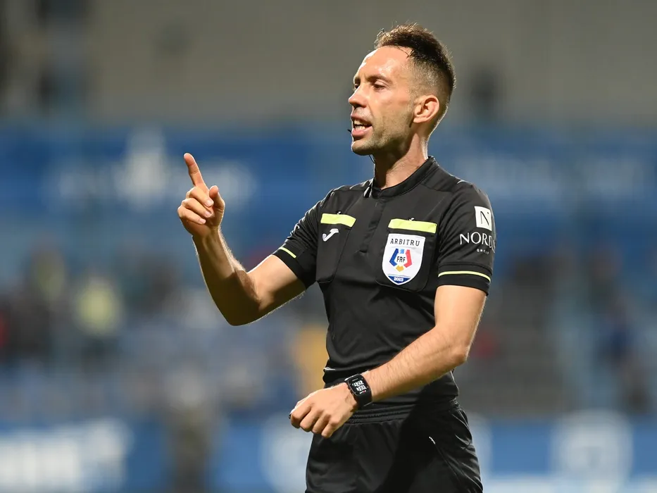 Arbitrul central George Catalin Gaman reactioneaza in meciul de fotbal dintre Farul Constanta si UTA Arad, contand pentru Superliga Superbet, desfasurat pe Stadionul central al Academiei Gheorghe Hagi din Ovidiu, joi 26 octombrie 2023.,Image: 819539313, License: Rights-managed, Restrictions: , Model Release: no