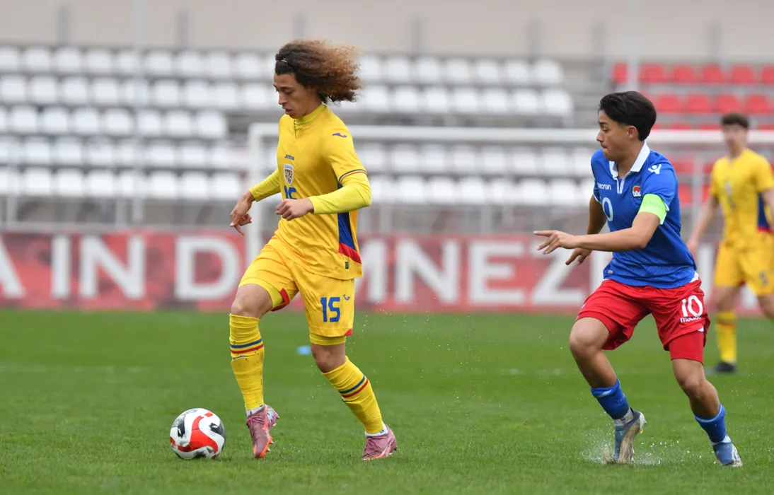 Rares Coman si Jason Beck in meciul de fotbal dintre Romania U18 si Liechtenstein U18 din Liga B, grupa B1, contand pentru calificarea la Campionatul European U19 2027, desfasurat pe Stadionul Arsenal din Tunari, sambata 28 martie 2026. © FOTO:Daniel George Ilinca/SPORT PICTURES