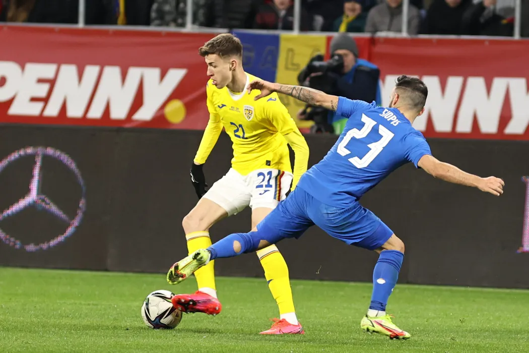 Octavian Popescu depaseste un adversar in timpul partidei amicale dintre reprezentativele nationale de fotbal ale Romaniei (echipament alb-galben) si Greciei, partida disputata vineri, 25 martie 2022, pe stadionul Steaua din Bucuresti. GEORGE FLUSTER / MEDIAFAX FOTO