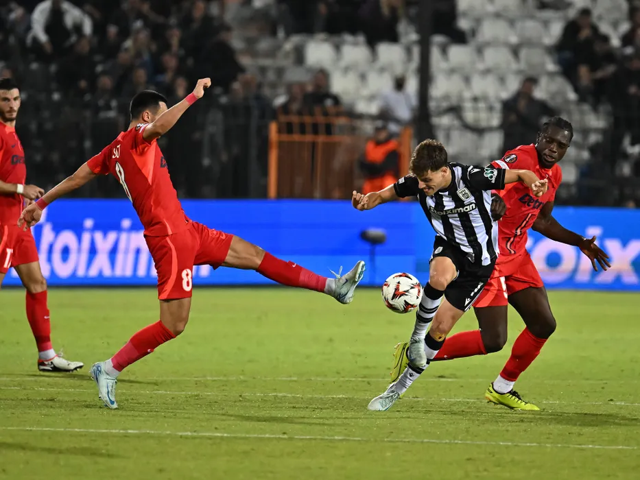 Adrian Gheorghe Șut, Giannis Konstantelias si Joyskim Aurelien Dawa Tchakonte in meciul dintre PAOK Salonic si FCSB, din cadrul UEFA Europa League, desfasurat pe Stadionul Toumba din Salonic, joi 3 octombrie 2024. © FOTO:Razvan Pasarica/SPORT PICTURES
