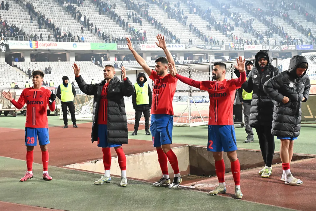 Fotbaliștii steliști Alexandru Marian Musi, George Daniel Bîrligea, Mihai Popescu, Valentin Crețu, Malcolm Edjouma si David Raul Miculescu salută galeria după meciul de fotbal dintre Universitatea Cluj si FCSB, contând pentru Superliga Superbet, desfășurat pe Cluj Arena din Cluj Napoca, duminica 10 noiembrie 2024. © FOTO:Răzvan Pasarica/SPORT PICTURES