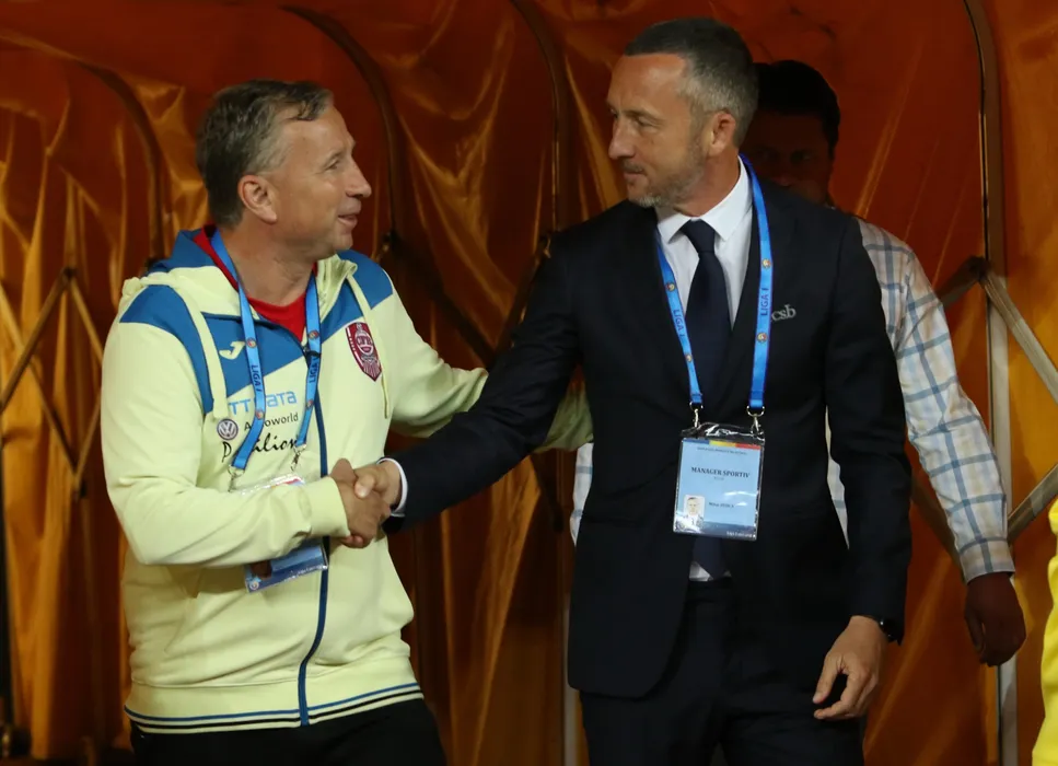 Antrenorul formatiei CFR Cluj, Dan Petrescu (S) si Mihai "Meme" Stoica, directorul sportiv al FCSB, isi strang mainile inaintea partidei dintre cele doua formatii, partida desfasurata in cadrul etapei a 7-a a play-off-ul Ligii I la fotbal, duminica 19 aprilie 2018, pe Arena Nationala din Bucuresti. GEORGE FLUSTER / MEDIAFAX FOTO