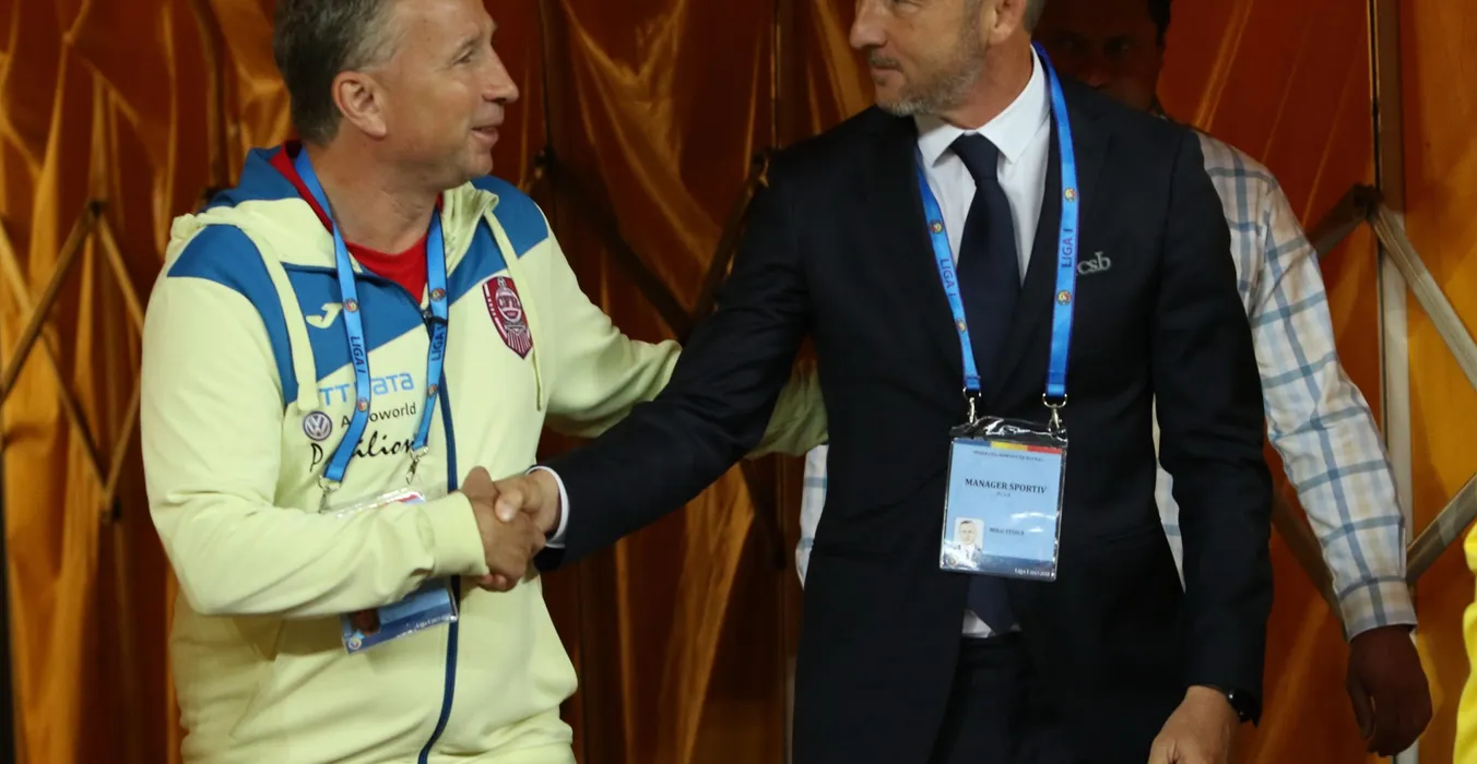 Antrenorul formatiei CFR Cluj, Dan Petrescu (S) si Mihai "Meme" Stoica, directorul sportiv al FCSB, isi strang mainile inaintea partidei dintre cele doua formatii, partida desfasurata in cadrul etapei a 7-a a play-off-ul Ligii I la fotbal, duminica 19 aprilie 2018, pe Arena Nationala din Bucuresti. GEORGE FLUSTER / MEDIAFAX FOTO