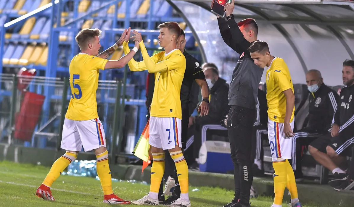 Claudiu Petrila, Octavian Popescu si Alexandru Cimpanu la schimbare in meciul amical de fotbal dintre Romania U21 si Georgia U21, desfasurat pe Stadionul Anghel Iordanescu din Voluntari, marti 7 septembrie 2021. © FOTO:Razvan Pasarica/SPORT PICTURES