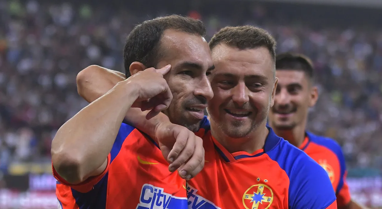 Paulo Vinicius De Souza Nascimento se bucura dupa un gol marcat alaturi de Andrei George Miron in meciul de fotbal dintre FCSB si Dinamo Bucuresti, contand pentru Liga 1 Casa Pariurilor, desfasurat pe Arena Nationala din Bucuresti, duminica 12 septembrie 2021. © FOTO:Razvan Pasarica/SPORT PICTURES
