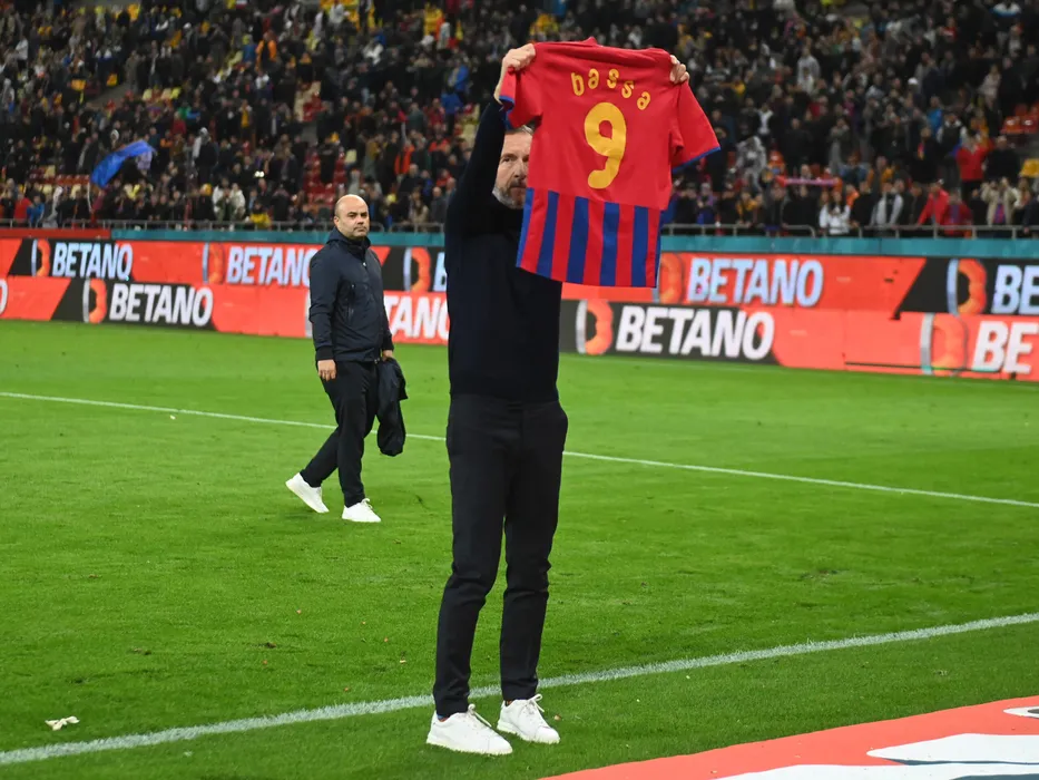 Mihai Stoica prezinta tricoul unui suporter stelist dupa meciul de fotbal dintre FCSB si Rapid Bucuresti, contand pentru Superliga Superbet, desfasurat pe Arena Nationala din Bucuresti, duminica 6 noiembrie 2022. © FOTO:Razvan Pasarica/SPORT PICTURES