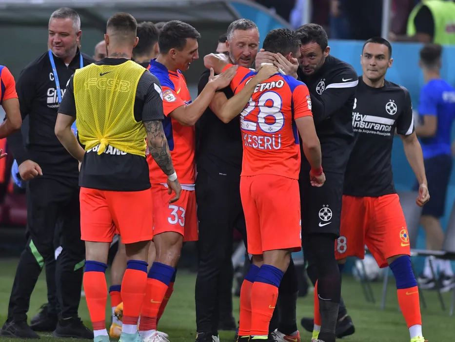 Claudiu Andrei Keseru este felicitat de catre Mihai Stoica si Catalin George Straton dupa un gol marcat in meciul de fotbal dintre FCSB si Dinamo Bucuresti, contand pentru Liga 1 Casa Pariurilor, desfasurat pe Arena Nationala din Bucuresti, duminica 12 septembrie 2021. © FOTO:Razvan Pasarica/SPORT PICTURES