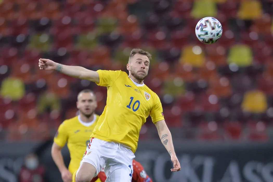 Reprezentativele Romaniei (echipament galben) si Macedoniei de Nord s-au intalnit intr-o partida contand pentru preliminariile CM 2022, joi 25 noiembrie 2021, pe Arena Nationala din Bucuresti. ALEXANDRU DOBRE / MEDIAFAX FOTO