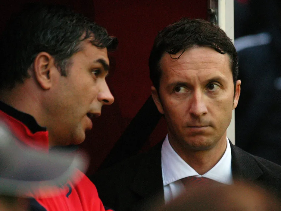 Cosmin Olaroiu alaturi de Mihai Stoica la meciul de fotbal dintre Middlesbrough FC si Steaua Bucuresti, contand pentru semifinala retur a Cupei UEFA, desfasurat pe Stadionul Riverside din Middlesbrough, joi 27 aprilie 2006. © FOTO:Razvan Pasarica/SPORT PICTURES