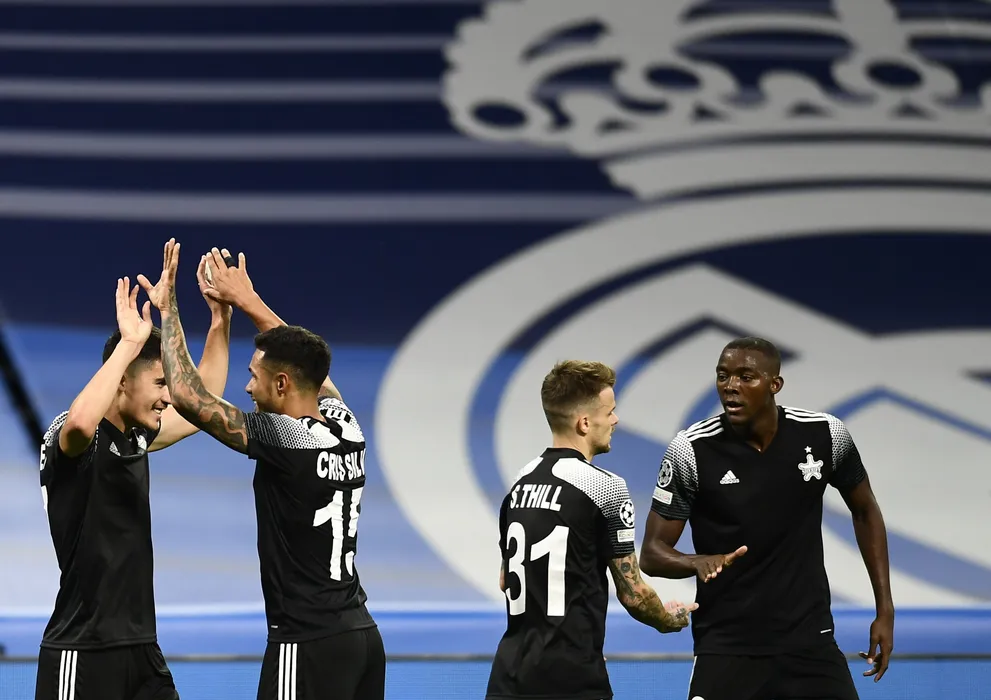 Sheriff's Jasurbek Yakhshiboev, left, celebrates with teammates after scoring his side's opening goal during the Champions League group D soccer match between Real Madrid and Sheriff, Tiraspol at the Bernabeu stadium in Madrid, Spain, Tuesday, Sept. 28, 2021. (AP Photo/Jose Breton)