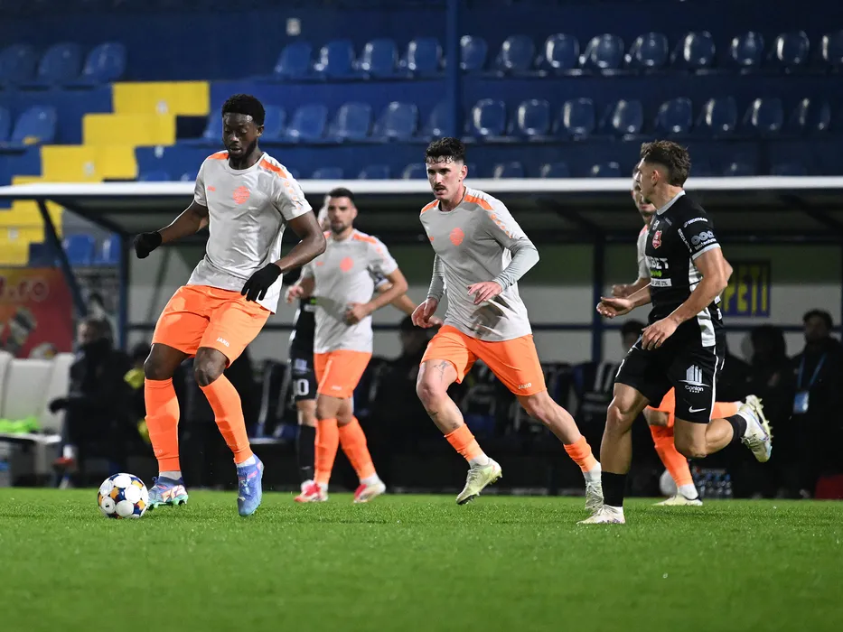 Aboubacar Camara, Tous Damia Sabater si Constantin Dragos Albu in meciul de fotbal dintre Metaloglobus Bucuresti si FC Hermannstadt, contand pentru Superliga Superbet, desfasurat pe Clinceni Arena din Clinceni, luni 24 noiembrie 2025. © FOTO:Razvan Pasarica/SPORT PICTURES