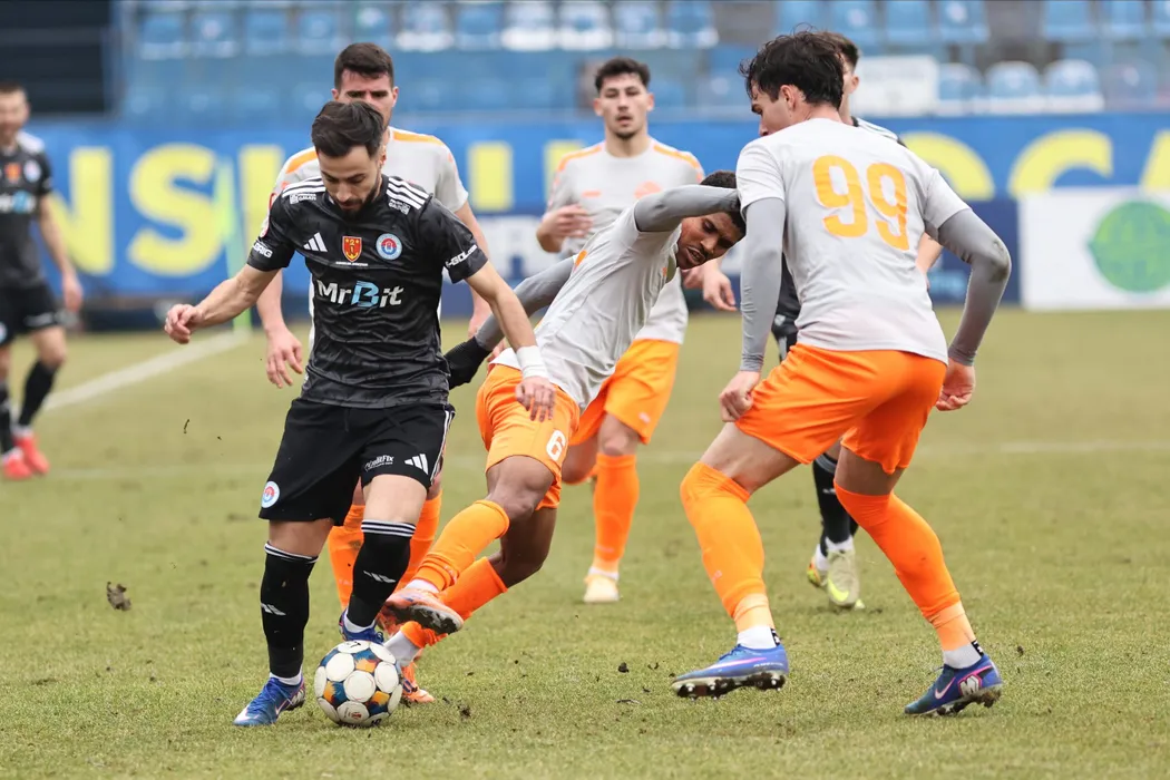 Virgil Andrei Ciobanu si Tous Damia Sabater, Robert Gabriel Badescu in meciul de fotbal dintre Metaloglobus Bucuresti si SC Otelul Galati, contand pentru Superliga Superbet, desfasurat pe Clinceni Arena din Clinceni, sambata 14 februarie 2026. © FOTO:Gheorghe Fluster/SPORT PICTURES