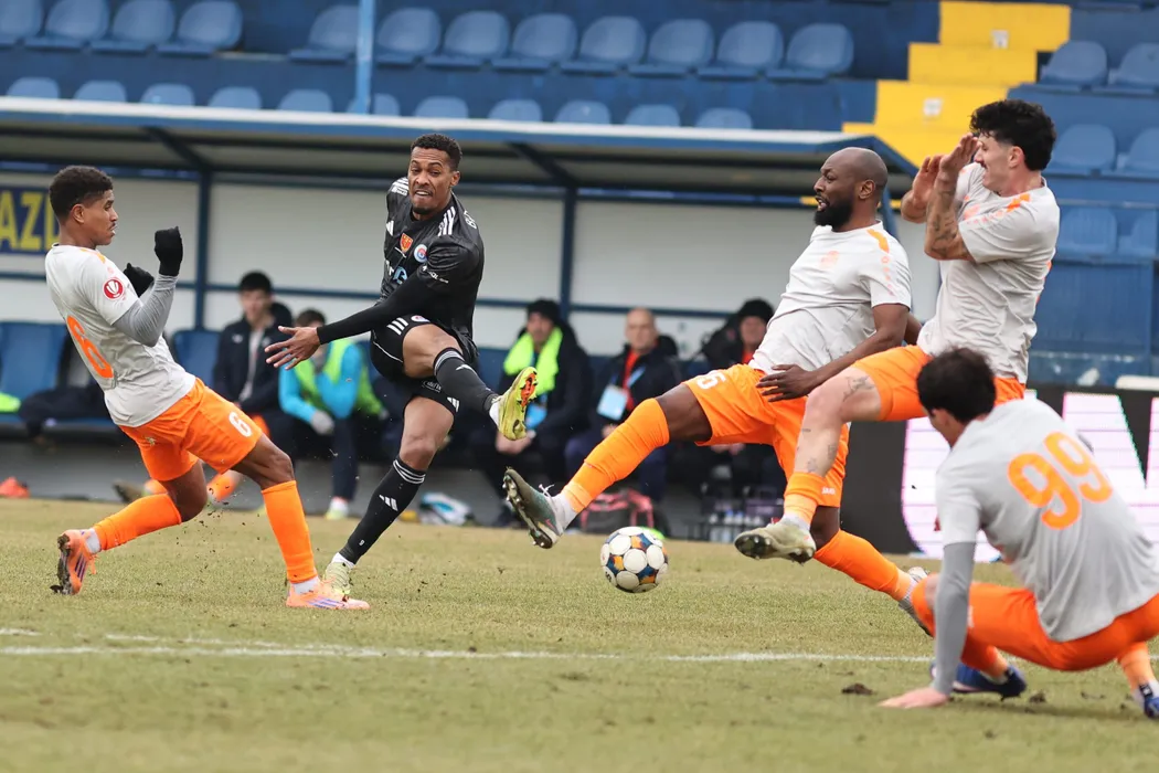Fernandes Fabio Patrick Dos Reis Dos Santos si Tous Damia Sabater, Mike Botuli Cestor, Bruno Jose Moreira Barreto De Carvalho in meciul de fotbal dintre Metaloglobus Bucuresti si SC Otelul Galati, contand pentru Superliga Superbet, desfasurat pe Clinceni Arena din Clinceni, sambata 14 februarie 2026. © FOTO:Gheorghe Fluster/SPORT PICTURES