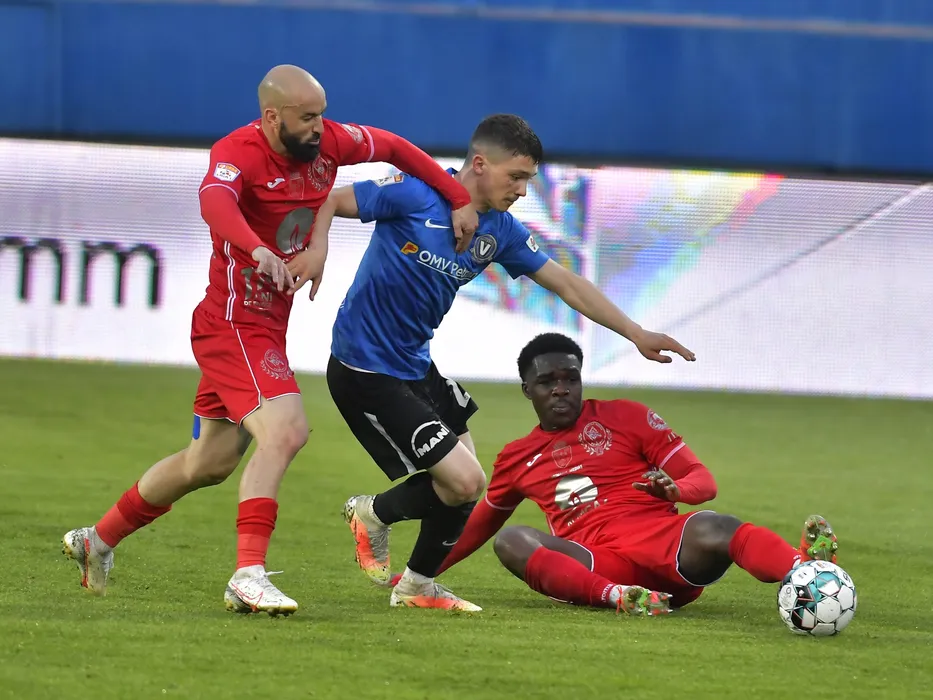 Gabriel De Moura Rodrigues, Florian Nichita Haita si Bryan Alceus in meciul de fotbal dintre FC Viitorul Constanta si Gaz Metan Medias, din cadrul Play-out-ul Ligii 1 Casa Pariurilor, desfasurat fara spectatori pe Stadionul Central al Academiei Gheorghe Hagi din Ovidiu, marti 20 aprilie 2021. © FOTO:Razvan Pasarica/SPORT PICTURES