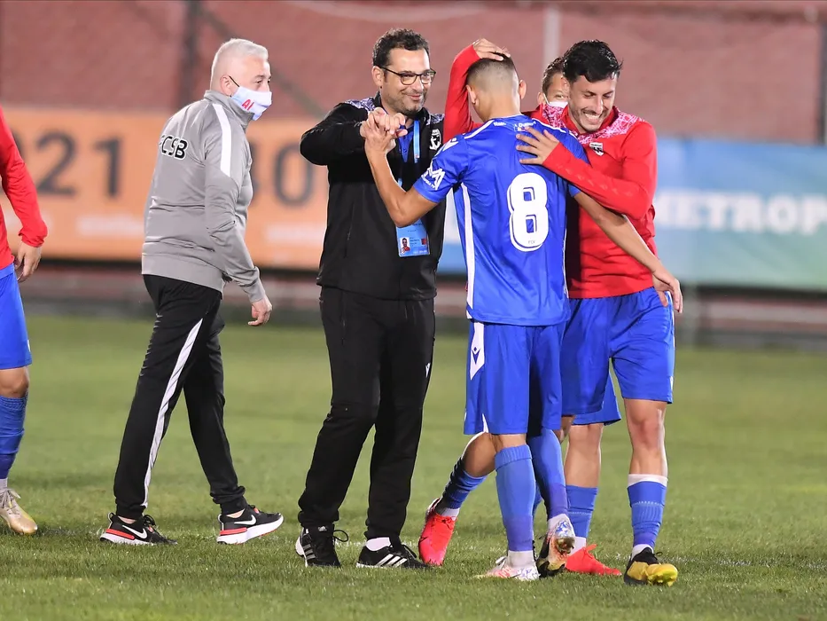 Mihai Teja ii felicita pe Ricardo Jose Veiga Varzim Miranda si Ion Gheorghe in meciul de fotbal dintre FC Voluntari si FCSB, contand pentru Liga 1 Casa Pariurilor, desfasurat fara spectatori pe Stadionul Anghel Iordanescu din Voluntari, sambata 12 septembrie 2020. © FOTO:Razvan Pasarica/SPORT PICTURES