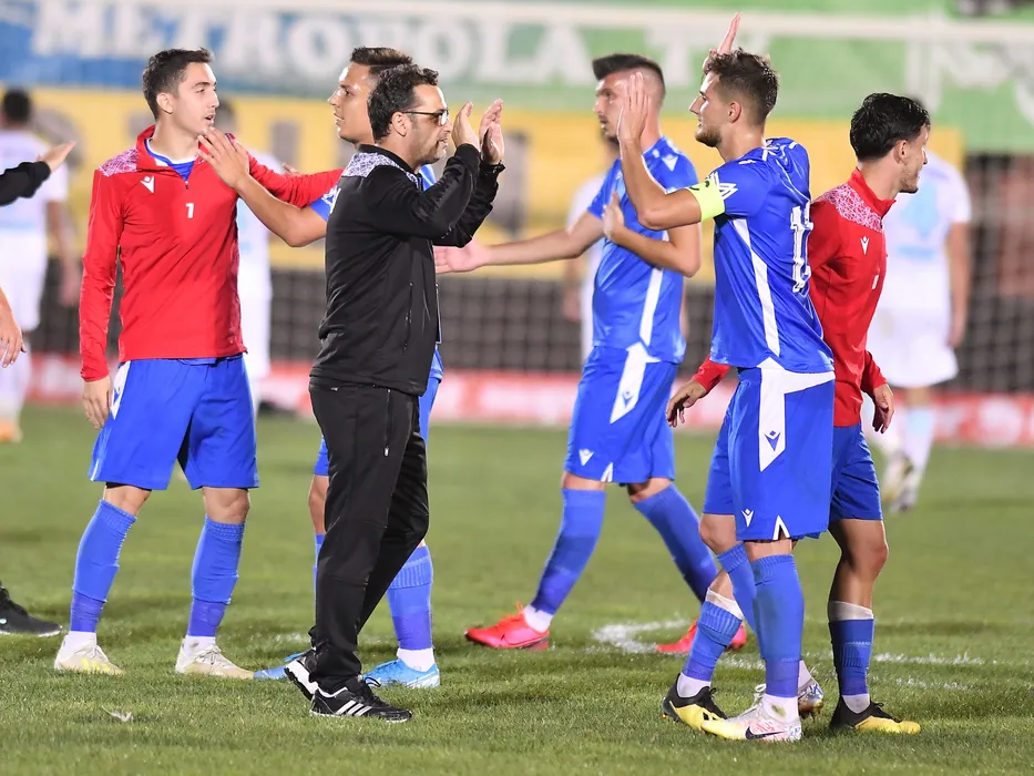 Mihai Teja il felicita pe Razvan Toni Gradinaru si Mihai Cristian Capatina in meciul de fotbal dintre FC Voluntari si FCSB, contand pentru Liga 1 Casa Pariurilor, desfasurat fara spectatori pe Stadionul Anghel Iordanescu din Voluntari, sambata 12 septembrie 2020. © FOTO:Razvan Pasarica/SPORT PICTURES