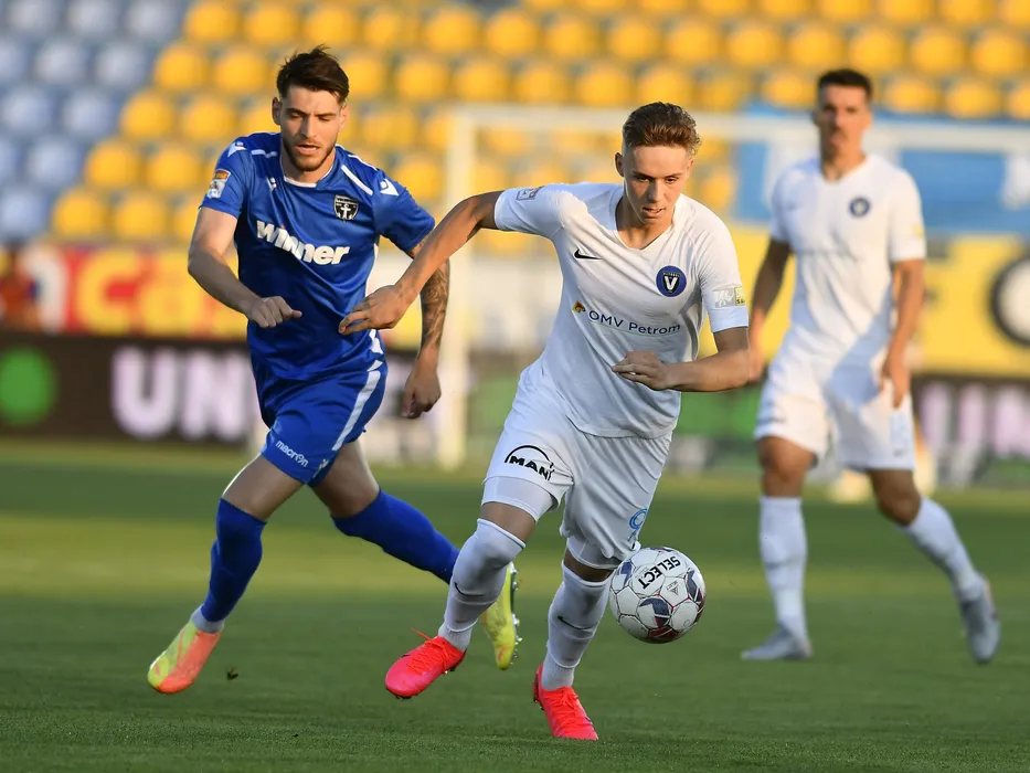 Louis Munteanu si Claudiu Belu Iordache in meciul de fotbal dintre FC Voluntari si FC Viitorul, contand pentru play-out-ul Ligii 1 Casa Pariurilor, disputat fara spectatori pe Stadionul Anghel Iordanescu din Voluntari, luni 6 iulie 2020.© FOTO:Razvan Pasarica/SPORT PICTURES
