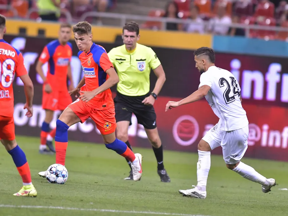 Octavian George Popescu si Roberto Romeo in meciul de fotbal dintre FCSB si Gaz Metan Medias, contand pentru Liga 1 Casa Pariurilor, desfasurat pe Arena Nationala din Bucuresti, duminica 8 august 2021. © FOTO:Razvan Pasarica/SPORT PICTURES