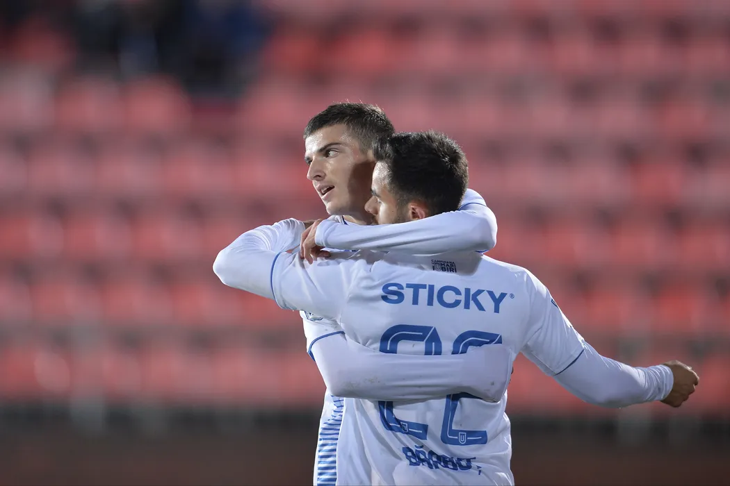 Valentin Mihaila (C) de la Universitatea Craiova este felicitat de un coechipier dupa ce a marcat in poarta celor de la FC Voluntari, in ultima partida al optimilor de finala din Cupa Romaniei la fotbal, joi 31 octombrie 2019, la Vountari. ALEXANDRU DOBRE / MEDIAFAX FOTO