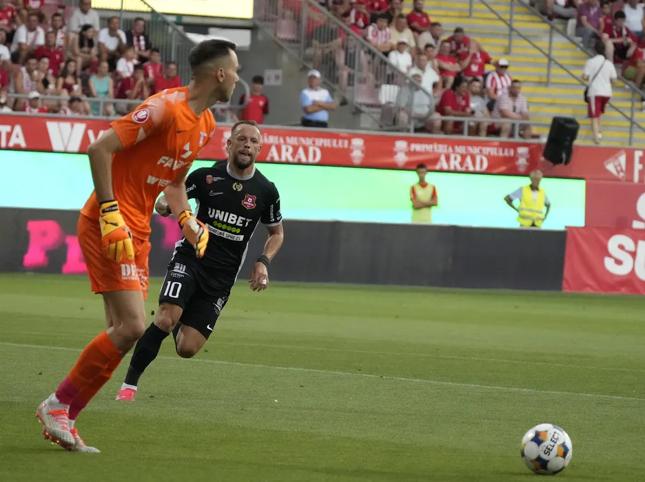 Deyan Iliev si Cristian Daniel Negut in meciul de fotbal dintre UTA Arad si AFC Hermannstadt Sibiu, contand pentru Superliga Superbet, desfasurat pe Arena Francisc Neuman din Arad, sambata 26 iulie 2025. © FOTO:Alexandra Fechete/SPORT PICTURES