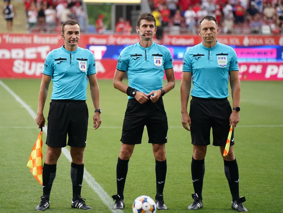 Brigada de arbitri formata din Horia Gabriel Mladinovici, Radu Adrian Ghinguleac si Raul Constantin Ghiciulescu la startul meciului de fotbal dintre UTA Arad si AFC Hermannstadt Sibiu, contand pentru Superliga Superbet, desfasurat pe Arena Francisc Neuman din Arad, sambata 26 iulie 2025. © FOTO:Alexandra Fechete/SPORT PICTURES