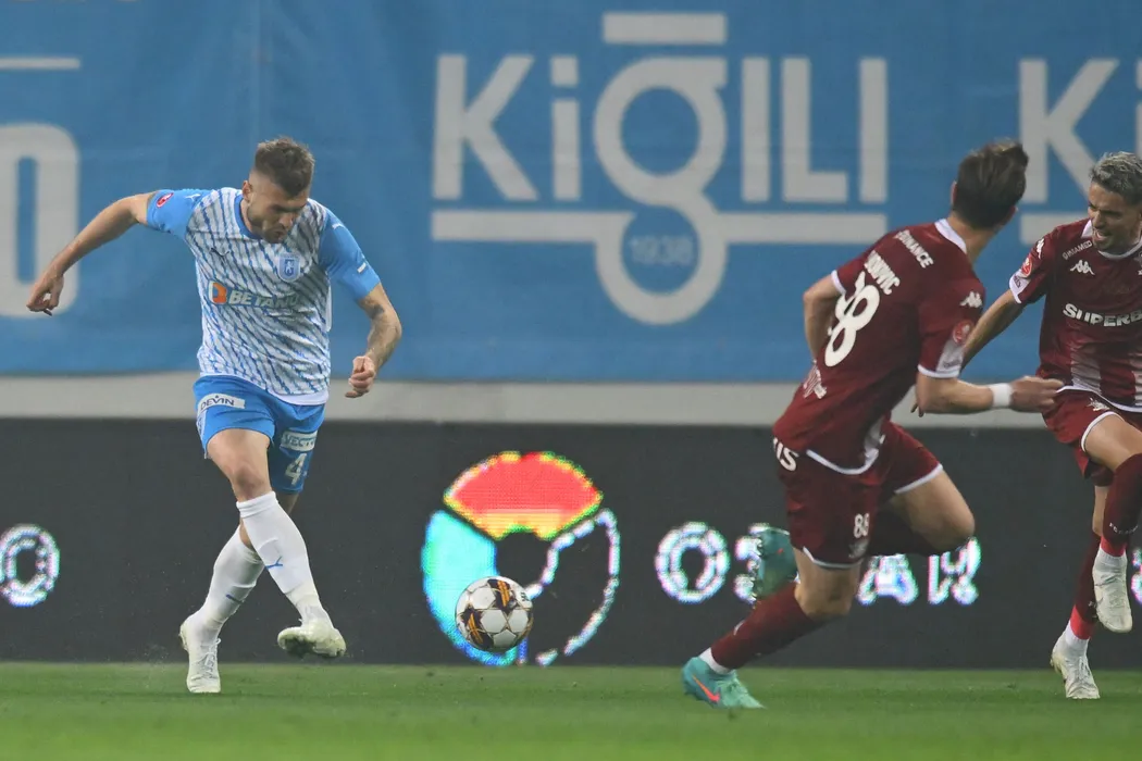 Alexandru Crețu si Albion Rrahmani în meciul de fotbal dintre Universitatea Craiova si Rapid Bucuresti, contând pentru Play off-ul Superligii Superbet, desfășurat pe Stadionul Ion Oblemenco din Craiova, sambata 30 martie 2024. © FOTO:SPORT PICTURES