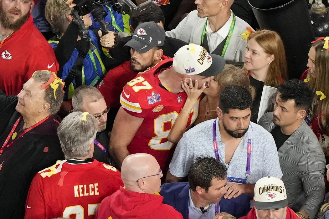 Kansas City Chiefs tight end Travis Kelce (87) kisses his girlfriend Taylor Swift after the team's victory over the San Francisco 49ers during the NFL Super Bowl 58 football game Sunday, Feb. 11, 2024, in Las Vegas.,Image: 845756571, License: Rights-managed, Restrictions: This content is intended for editorial use only. For other uses, additional clearances may be required., Model Release: no, Pictured: Travis Kelce