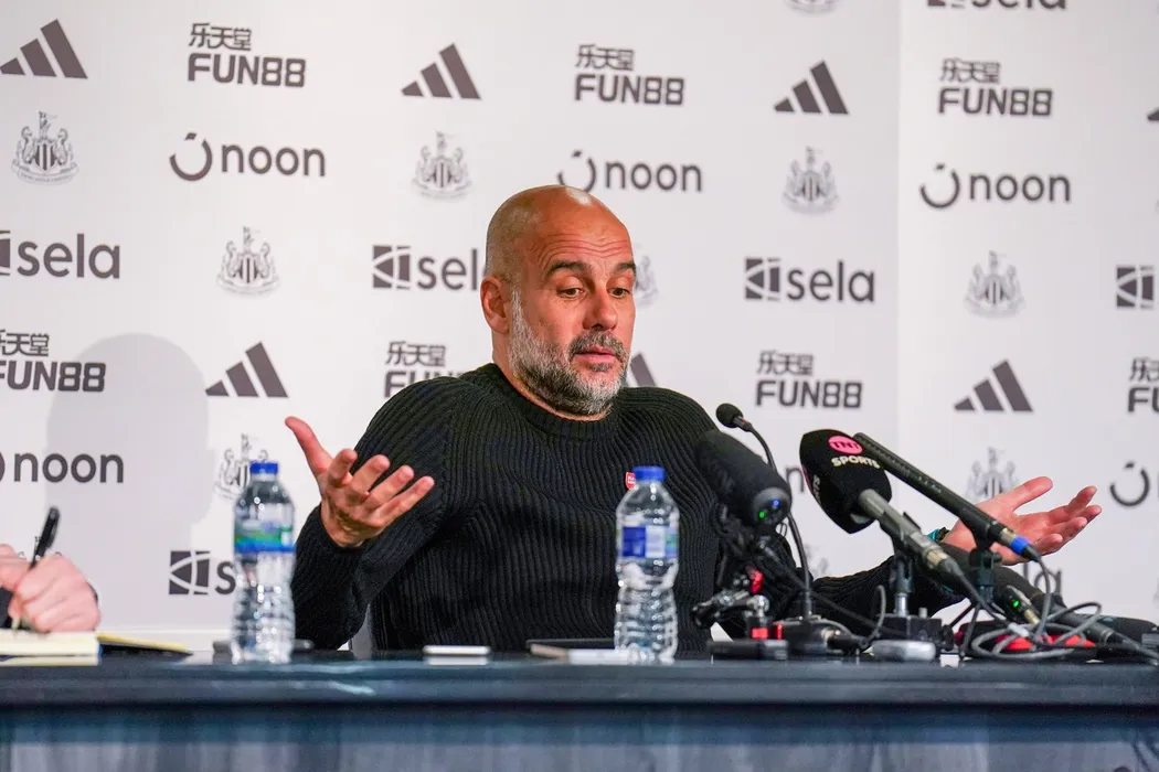 Newcastle United FC v Manchester City FC Manchester City Manager Pep Guardiola post match media press interview reacts with hands during the Newcastle United FC v Manchester City FC English Premier League match at St.James Park, Newcastle, England, United Kingdom on 28 September 2024 Editorial use only. All images are copyright Every Second Media Limited. No images may be reproduced without prior permission. All rights reserved. Premier League and Football League images are subject to licensing agreements with Football DataCo Limited. see https://www.football-dataco.com Copyright: x/EveryxSecondxMediax ESM-1143-0102,Image: 913231944, License: Rights-managed, Restrictions: , Model Release: no