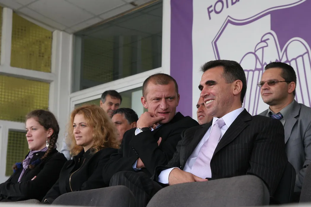 Dorinel Munteanu (centru dreapta) discuta cu patronul echipei FC Arges, Cornel Penescu (dreapta), in timpul meciului amical de fotbal dintre FC Arges si FC national, la Pitesti, sambata, 7 octombrie 2006. IONEL IANCU / MEDIAFAX FOTO