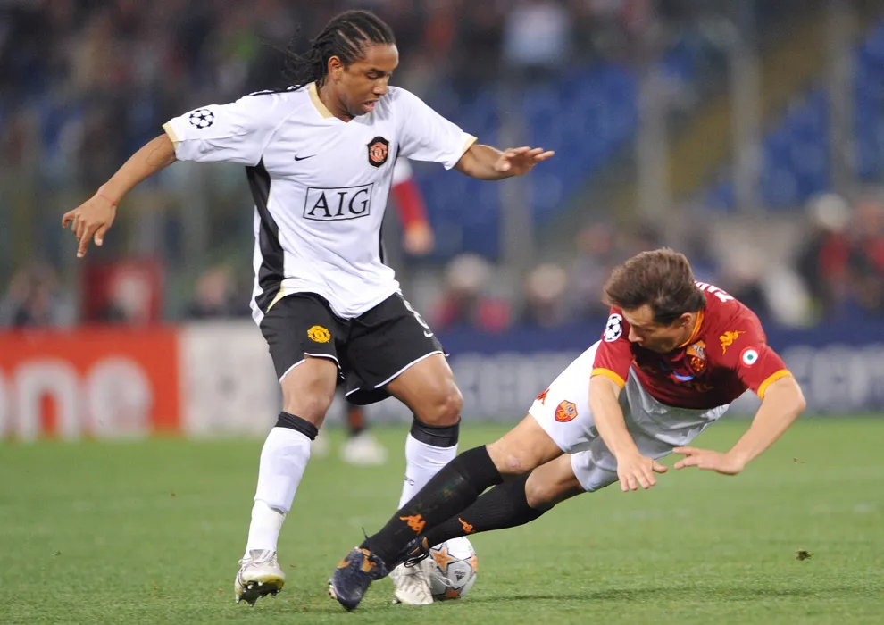 Manchester United midfielder Anderson of Brazil fights for the ball with AS Roma's midfielder Rodrigo Taddei of Brazil during their Champions League quarter-final, first leg football match at the Olympic Stadium in Rome on April 1, 2008.,Image: 24859916, License: Rights-managed, Restrictions: , Model Release: no
