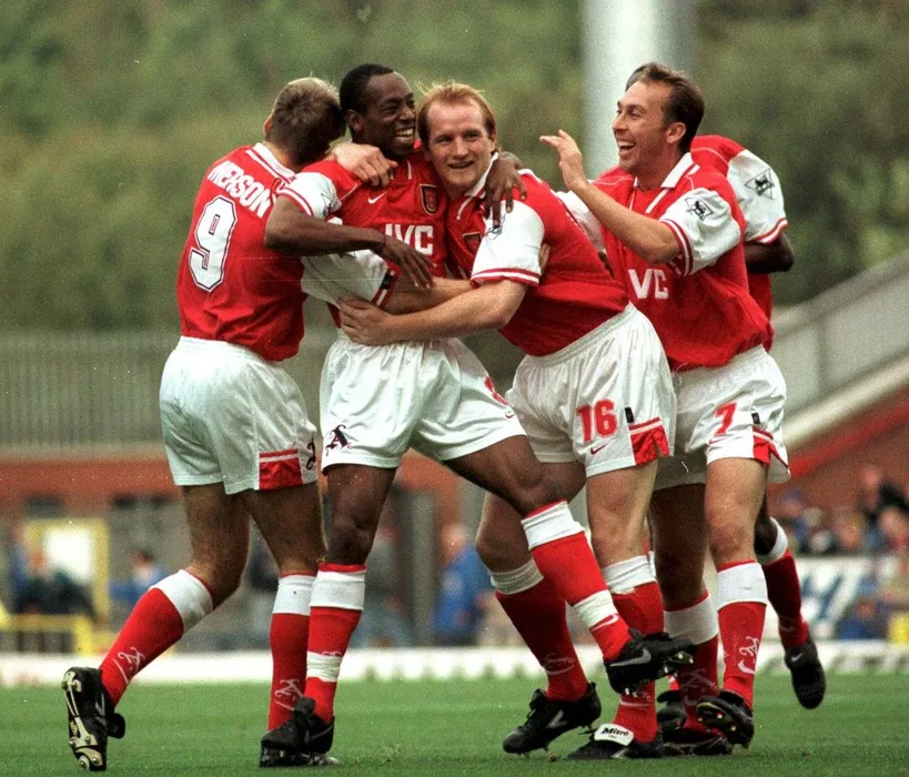 File photo dated 12-10-1996 of Joy for Arsenal teammates Merson (left) John Hartson (second right) and David Platt as they celebrate with double goal scorer Ian Wright during today's match against Blackburn., Image: 301031717, License: Rights-managed, Restrictions: WCDIRECT FILE PHOTO, Model Release: no, Credit line: Paul Barker / PA Images / Profimedia