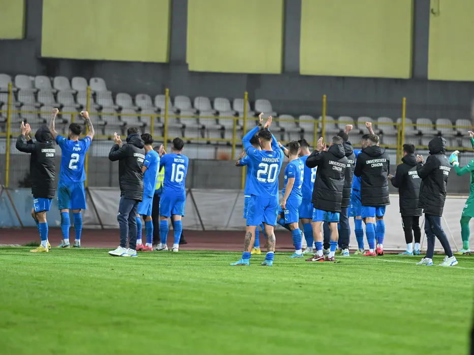 Fotbalistii craioveni saluta galeria dupa meciul de fotbal dintre FC Hermannstadt si Universitatea Craiova, contand pentru Cupa Romaniei, desfasurat pe stadionul Municipal din Medias, miercuri 19 octombrie 2022. © FOTO:Razvan Pasarica/SPORT PICTURES