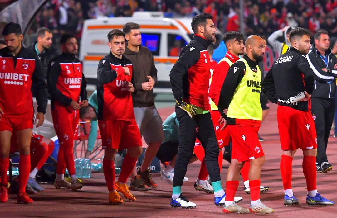 Fotbalistii dinamovisti Andrei Radu, Figueiredo Cristiano Pereira, Gabriel Rodrigues De Moura si Alexandru Ilie Rauta suparati dupa meciul de fotbal dintre Dinamo Bucuresti si Universitatea Cluj, Barajul pentru mentinerea in Liga 1 Casa Pariurilor, desfasurat pe Stadionul Dinamo din Bucuresti, duminica 29 mai 2022. © FOTO:Razvan Pasarica/SPORT PICTURES