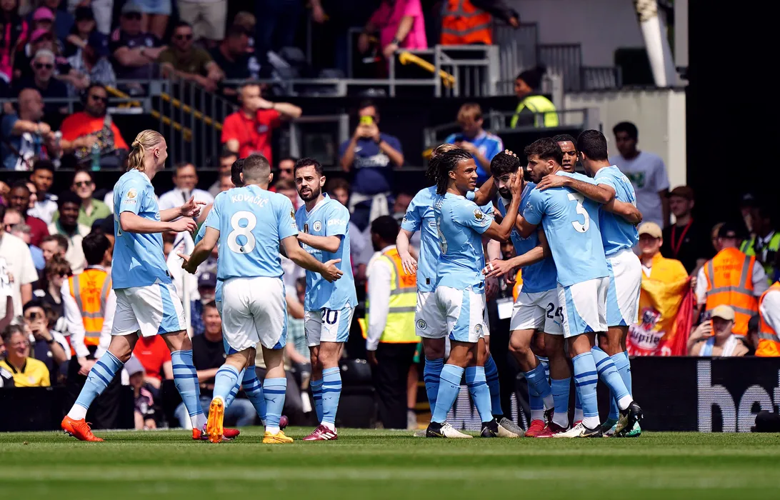 11 May 2024, United Kingdom, London: Manchester City's Josko Gvardiol (4th R) celebrates with teammates after scoring their side's first goal during the English Premier League soccer match between Fulham and Manchester City at Craven Cottage, London. Photo: Zac Goodwin/PA Wire/dpa