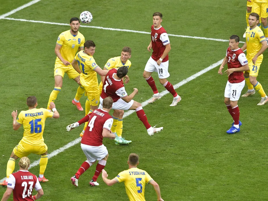 Roman Yaremchuk, Mykola Matviyenko, Christoph Baumgartner, Stefan Lainer si Oleksandr Karavaev in meciul de fotbal dintre Ucraina si Austria, din cadrul EURO 2020, desfasurat pe Arena Nationala din Bucuresti, luni 21 iunie 2021. © FOTO:Razvan Pasarica/SPORT PICTURES