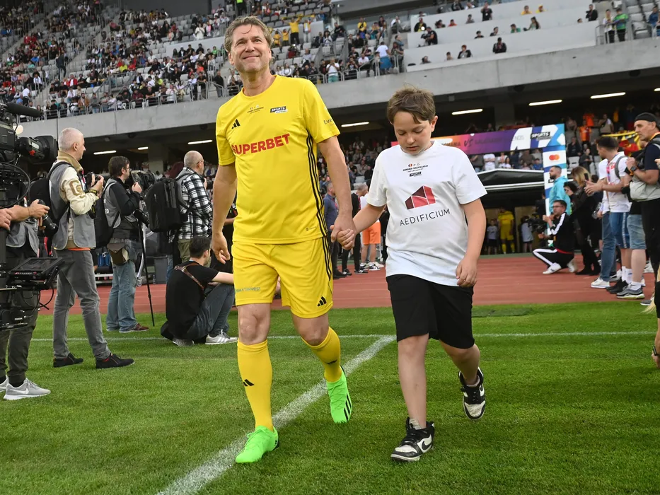 „Minunea Blondă” a rămas neschimbat: Florin Răducioiu, magnet pentru copii la meciul Romania All Stars – Galatasaray Legends! Fostul atacant al lui AC Milan a dat autografe direct pe teren | FOTO