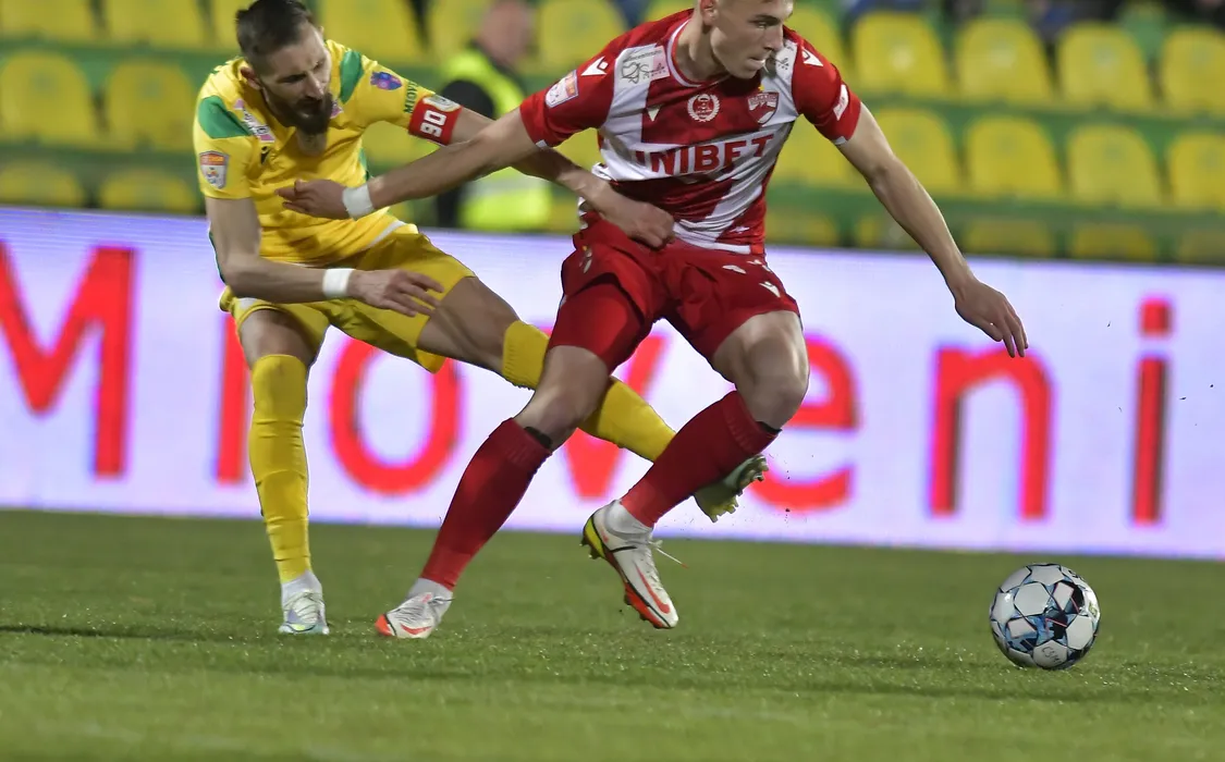 Gheorghe Bogdan Rusu si Balthazar Jean Phillipe Marie Pierret in meciul de fotbal dintre CS Mioveni si Dinamo Bucuresti, contand pentru Play-out-ul Ligii 1 Casa Pariurilor, desfasurat pe Stadionul Orasenesc din Mioveni, vineri 15 aprilie 2022. © FOTO:Razvan Pasarica/SPORT PICTURES