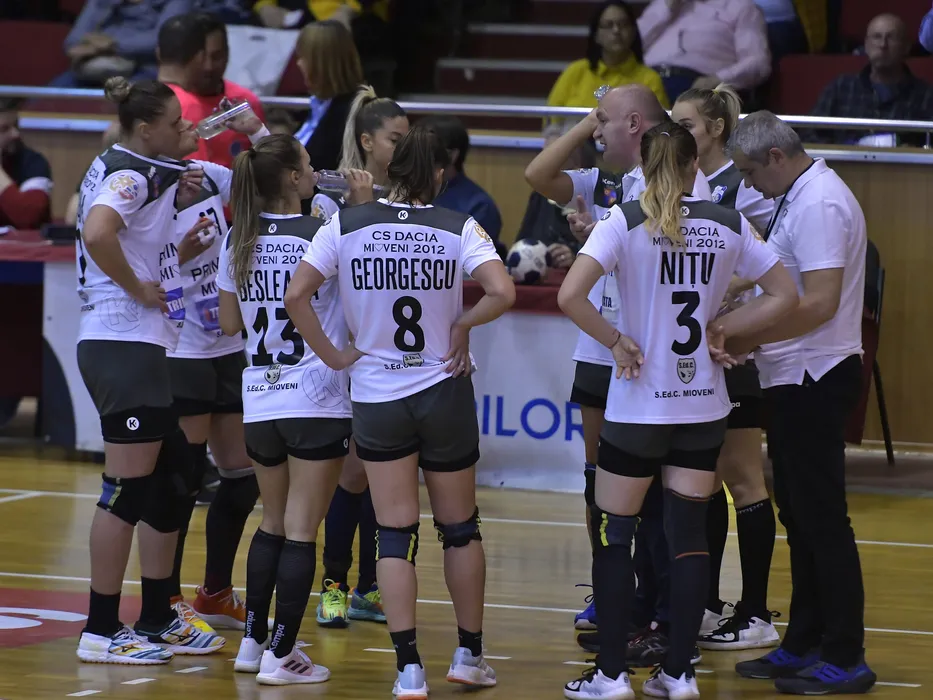 Handbalistele din Mioveni la un timeout alaturi de antrenorul lor Goran Kurtes in meciul de handbal feminin dintre CSM Bucuresti si CS Dacia Mioveni, contand pentru Liga Florilor, desfasurat in Sala Rapid din Bucuresti, miercuri 18 mai 2022. © FOTO:Razvan Pasarica/SPORT PICTURES