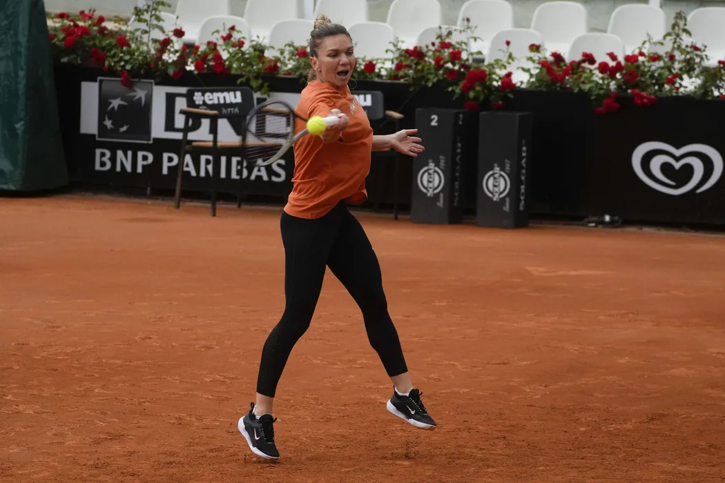 Simona Halep, of Romania, returns the ball during a training session on the occasion of the Italian Open tennis tournament, in Rome, Friday, May 6, 2022. (AP Photo/Gregorio Borgia)
