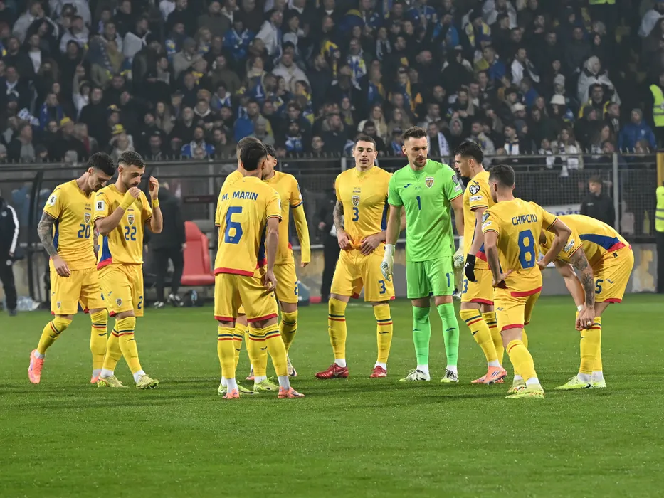 Fotbalistii romani Dennis Man, Vlad Dragomir, Bogdan Racovitan, Ionut Radu, Valentin Mihaila si Alexandru Mihaita Chipciu se incurajeaza inaintea meciului de fotbal dintre Bosnia Hertegovina si Romania, din cadrul Preliminariilor Campionatului Mondial 2026, desfasurat pe Stadionul Bilino Polje din Zilina, sambata 15 noiembrie 2025. © FOTO:Razvan Pasarica/SPORT PICTURES