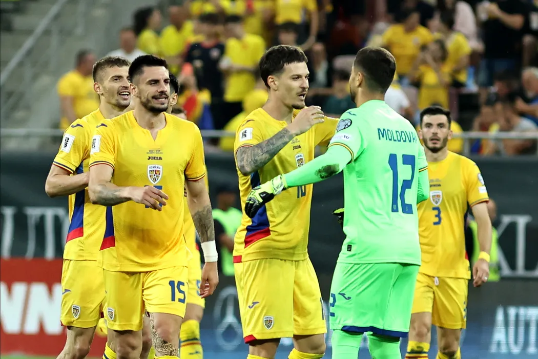 Jucatorii echipei nationale de fotbal a Romaniei reactioneaza dupa ce Dennis Man (C) a inscris un gol in timpul meciului contra selectionatei Ciprului din preliminariile Cupei Mondiale din 2026, disputat pe Arena Nationala din Romania, marti, 10 iunie 2025. GEORGE FLUSTER / MEDIAFAX FOTO