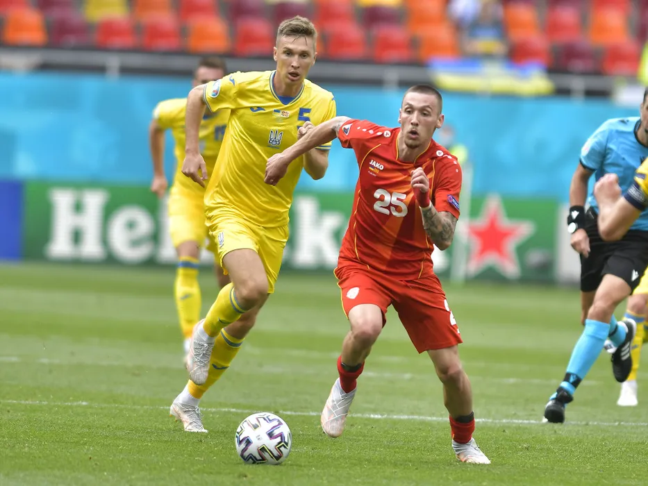 Serhiy Sydorchuk si Darko Churlinov in meciul de fotbal dintre Ucraina si Macedonia de Nord, din cadrul EURO 2020, desfasurat pe Arena Nationala din Bucuresti, joi 17 iunie 2021. © FOTO:Razvan Pasarica/SPORT PICTURES